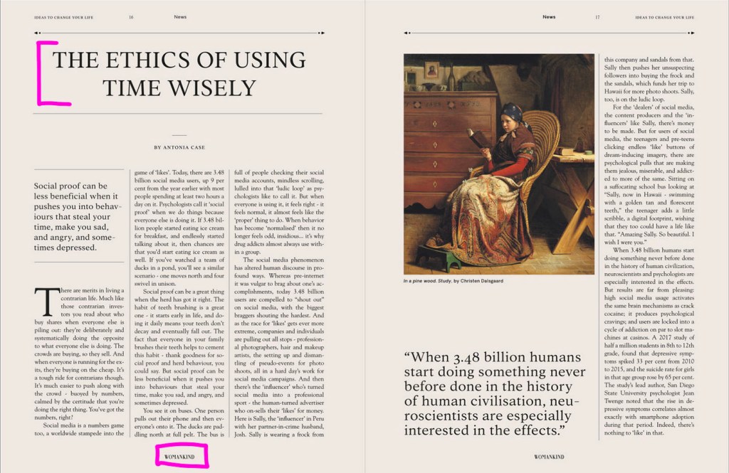 I found this image of a magazine spread from Womankind Magazine and it was created by a studio called Patten. Patten is a freelance design studio located in Spain with a goal of developing creative content. Also, Womankind Magazine is an “advertising-free women’s magazine on self, identity, and meaning in today’s society.”