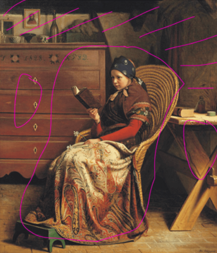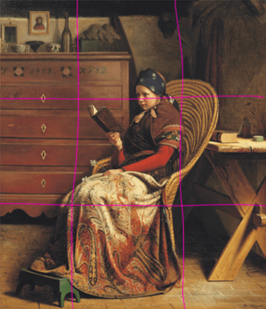 I would say that this image follows the Rule of Thirds and Depth of Field. In the first image I drew out a grid to represent the Rule of Thirds, and it seems to line up fairly well. I think to make it better the girl would have needed to be more to right, but overall it seems to sit on the three corners of that middle square. I would also say that Depth of Field is apparent. The girl and her chair are the focus point in the foreground. Then, we have the table and the dresser and the objects in the middleground that fall behind the girl but don’t seem super far away. Lastly, I put lines in the very back to show the background. This would be the wall, the objects on the dresser, and anything that is hanging on the wall.
