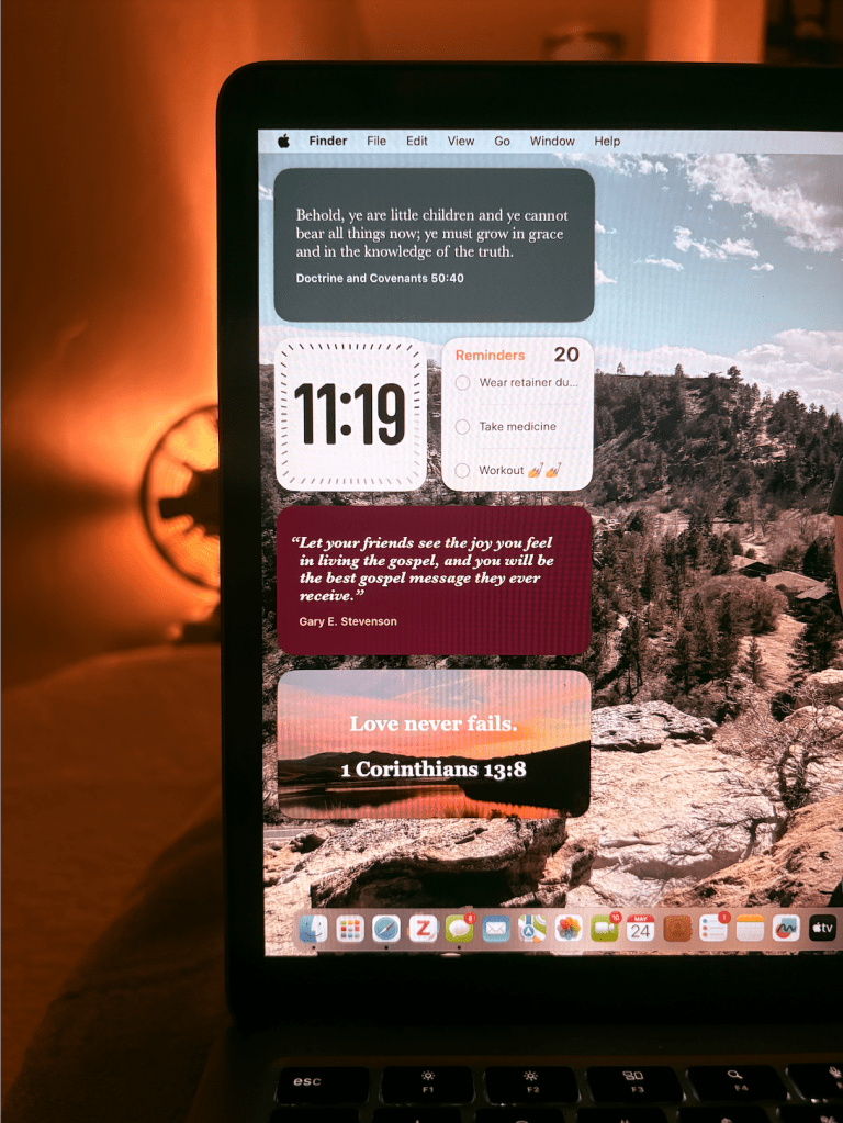 My photos mimic the original because they all have that sort of cozy vibe and they all have a representation of time. The first is my shadow of me checking my watch which not only shows me physically checking the time, but also the light is because of the sun setting or the time of day almost being done. The second is showing the widget on my computer that has a clock (even though the computer already shows it in the top right). The last one you can see a missionary countdown calendar in the background. They also use the same concepts. The Rule of Thirds is in play because each main section of the image is imagined to be on those right side line intersections. They also follow the Field of Depth as some objects are very close to the camera while others are much further.